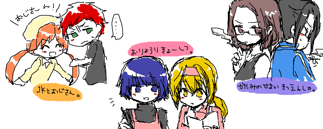 何か描こうとしてbotに話しかけて、ランダムで出てきた子を組み合わせて何かを描くという遊びをしてみたくて試してるんですけど、昨日出てきた子は清彦→真実という流れだったのでこんなのを描いてた。