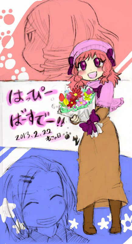 背景の子はらぎさんの創作の子です。ゆっこモッテモテやんなぁニヤニヤ。花束は上の子がくれた設定なんですって意地っ張りめ!